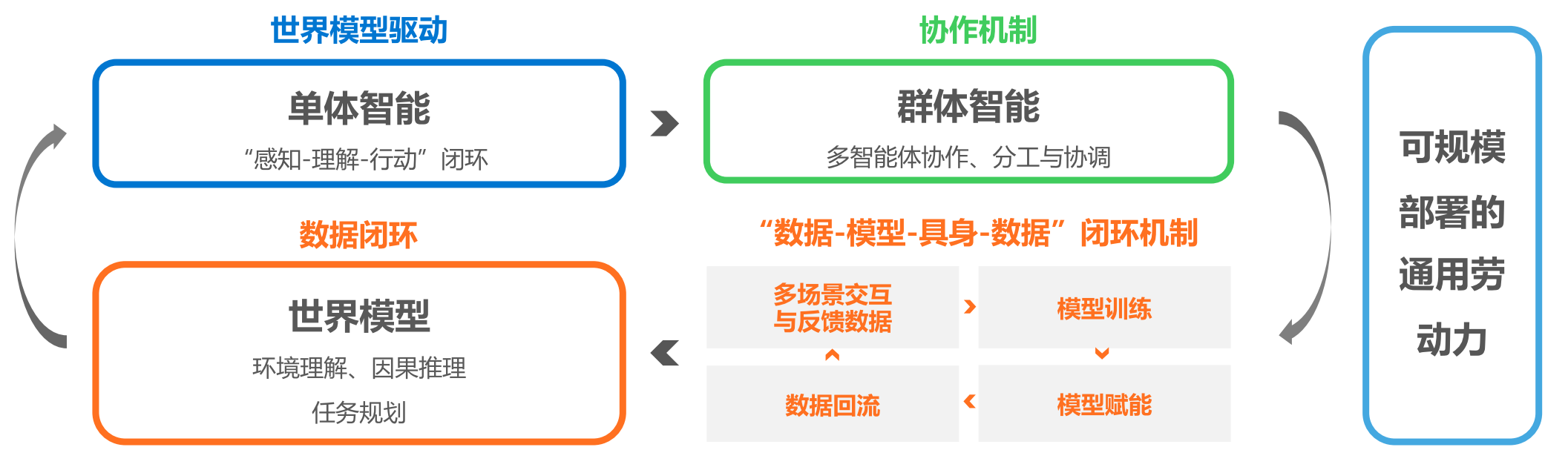 具身智能将形成从理解世界、到个体行动、再到群体协作的技术演进路径,推动智能体(如智能机器人、自动驾驶汽车、自主航行器等)具备物理常识、因果推理与空间理解能力,并最终转化为可规模部署的通用劳动力。从技术路径看,具身智能的发展链条可概括为从“单体智能”升级到“群体智能”的过程:发展起点在于单体具身智能完成“感知-理解-行动”闭环,在真实环境中进行持续交互并提升自主规划与动作决策能力;当单体智能趋于成熟后,其能力边界将扩展至多智能体协作,通过分工与协调形成更高层次的群体智能体系。在这一演进过程中,世界模型起关键支撑作用,其通过提供环境理解、因果推断与任务规划的统一框架,使具身智能具备跨场景泛化能力。